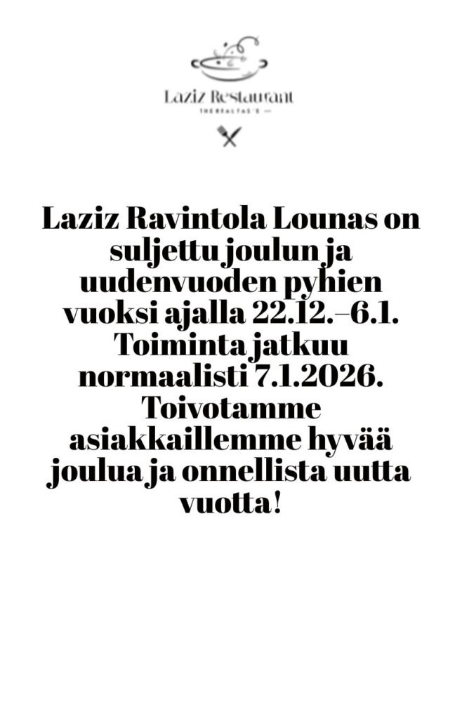 Tervetuloa nauttimaan Lähi-idän tunnelmasta ja herkuista Laziz Restaurantiin. Tarjoamme herkullisen ja edullisen sekoituksen erilaisia grilliruokia, kuten kanaa, kebabia ja falafeleja, sekä muita itämaisia herkkuja, pizzoja, salaatteja ja paljon muuta. Ruokalistaltamme löytyvät annokset on valmistettu mureasta lihasta, täydellisesti grillattuna.